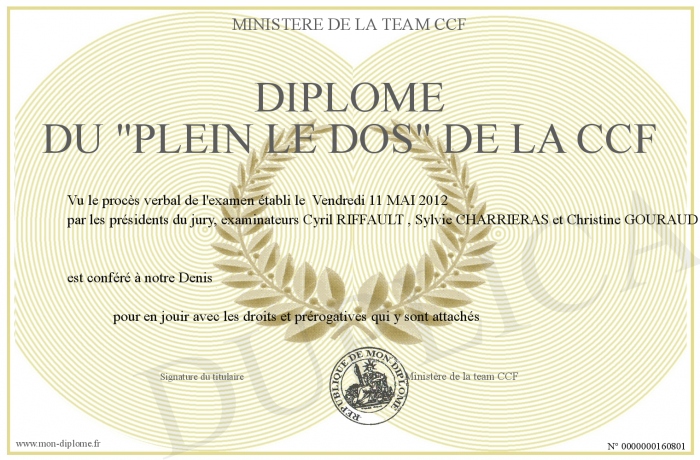 Envoyez par email votre Diplôme du -plein le dos- de la CCF personalisé