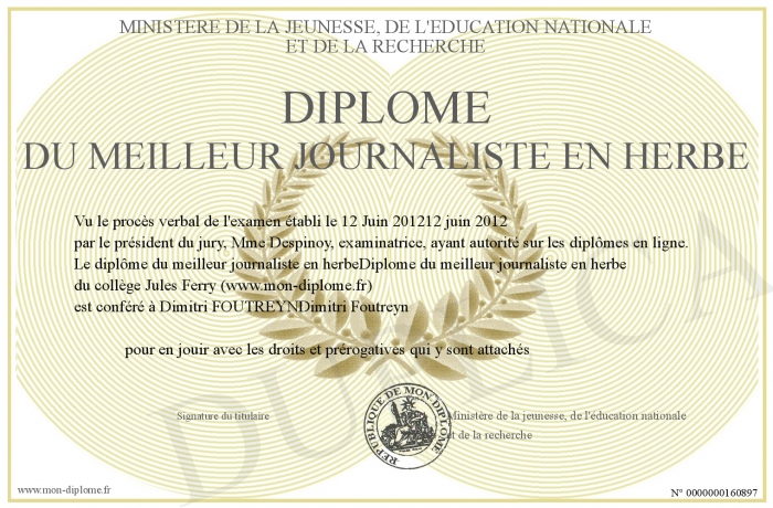 Envoyez par email votre Diplôme du meilleur journaliste en herbe personalisé