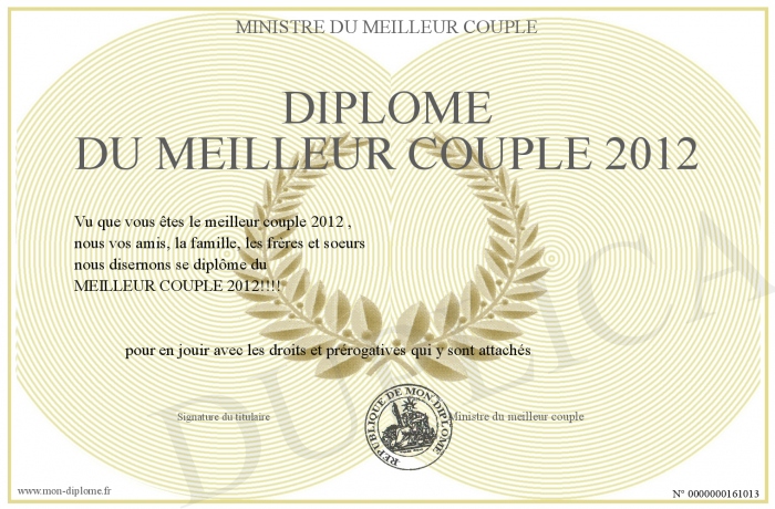 Envoyez par email votre Diplôme du meilleur couple 2012 personalisé