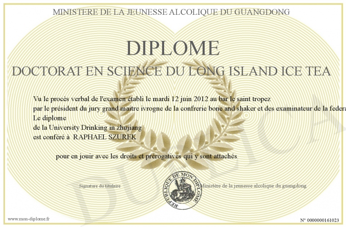 Envoyez par email votre Diplôme doctorat en science du long island ice tea personalisé