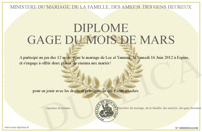 Envoyez par email votre Diplôme gage du mois de Mars personalisé