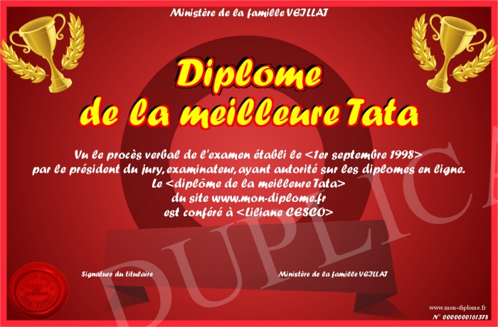 Envoyez par email votre Diplome de la meilleure Tata personalisé