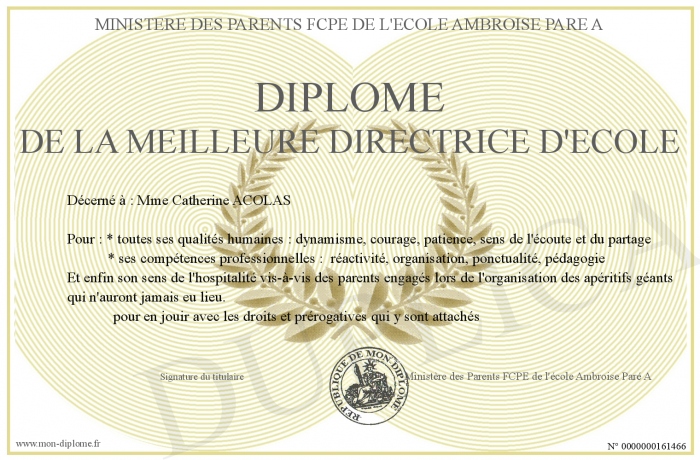 Envoyez par email votre Diplôme de la meilleure directrice d'école personalisé