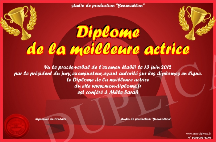 Envoyez par email votre Diplôme de la meilleure actrice personalisé