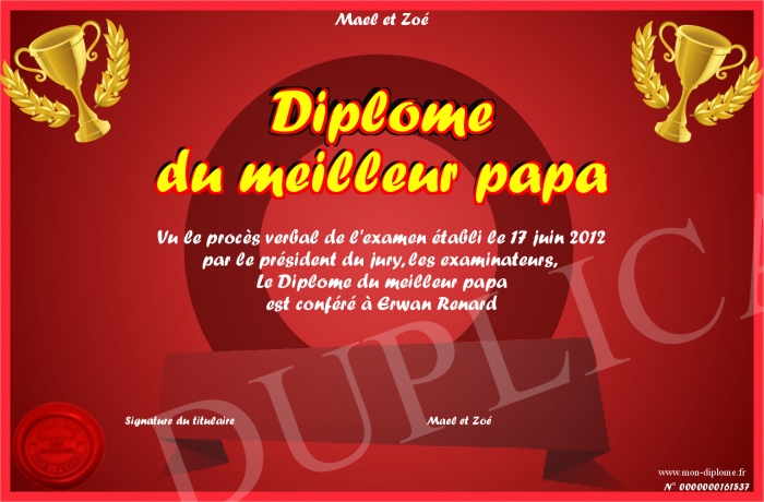 Envoyez par email votre Diplôme du meilleur papa personalisé