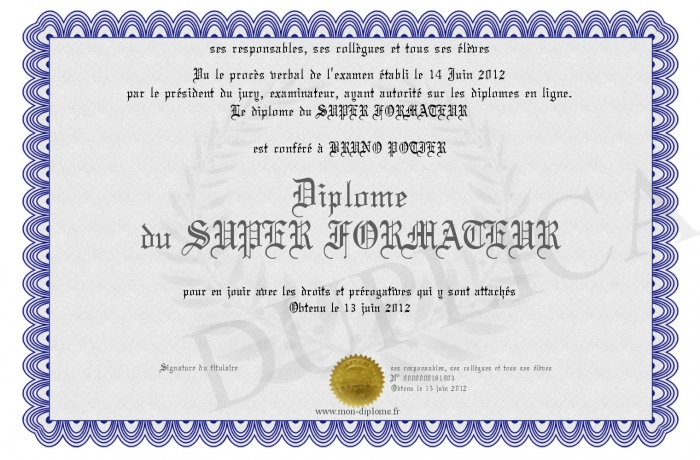 Envoyez par email votre Diplôme du SUPER FORMATEUR personalisé