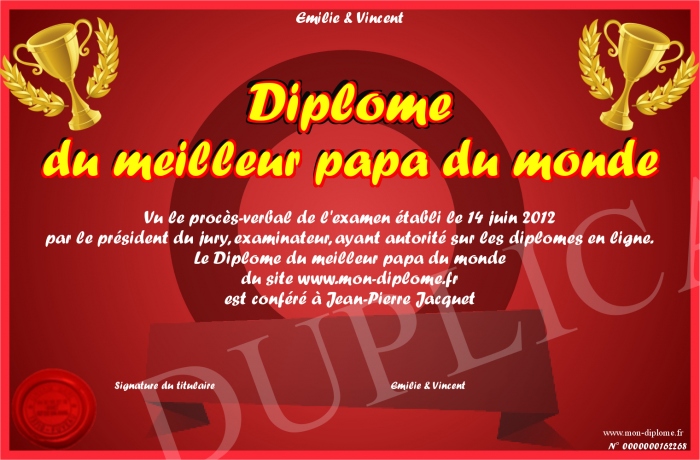Envoyez par email votre Diplôme du meilleur papa du monde personalisé