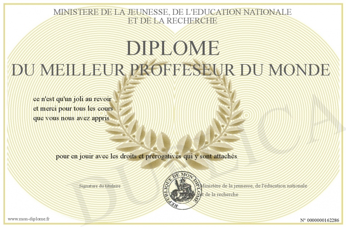 Envoyez par email votre Diplôme du meilleur proffeseur du monde personalisé