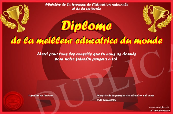 Envoyez par email votre Diplôme de la meilleur educatrice du monde personalisé