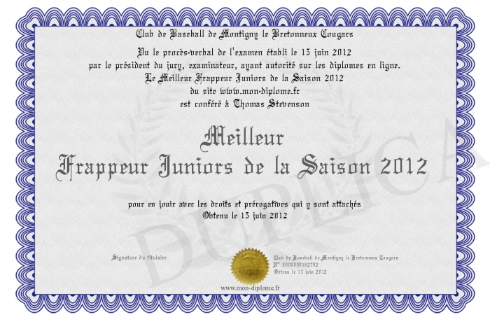 Envoyez par email votre Meilleur Frappeur Juniors de la Saison 2012 personalisé