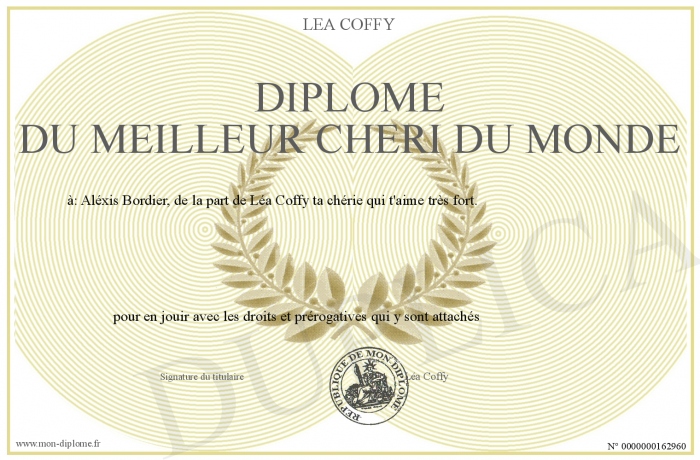Envoyez par email votre Diplôme du meilleur chéri du monde personalisé