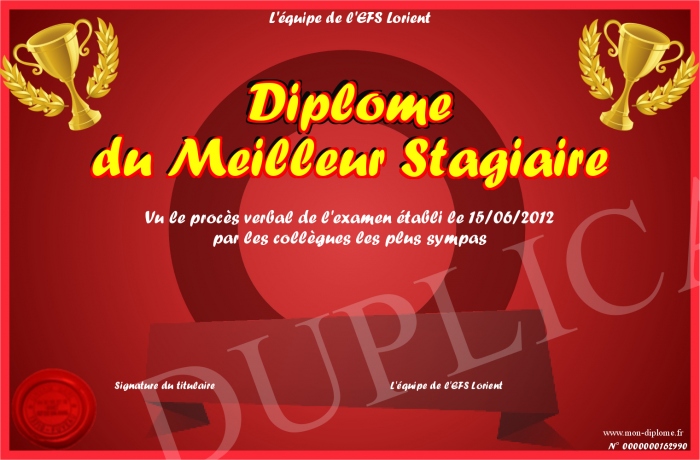 Envoyez par email votre Diplôme du Meilleur Stagiaire personalisé