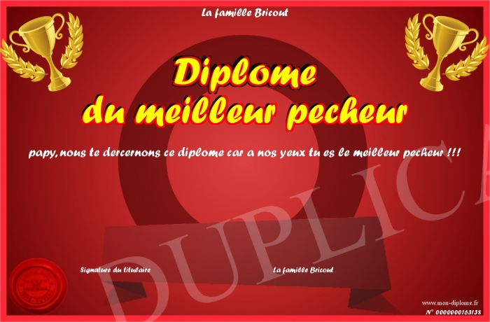 Envoyez par email votre Diplôme du meilleur pecheur personalisé