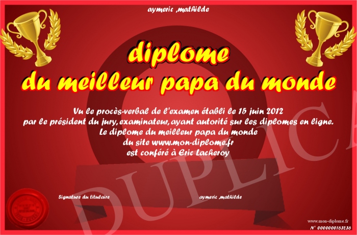 Envoyez par email votre diplome du meilleur papa du monde personalisé