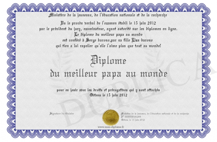 Envoyez par email votre Diplôme du meilleur papa au monde personalisé
