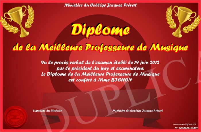 Envoyez par email votre Diplôme de la Meilleure Professeure de Musique personalisé