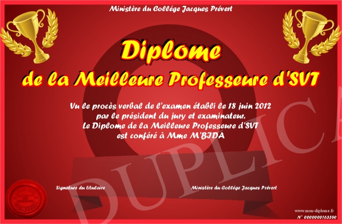 Envoyez par email votre Diplôme de la Meilleure Professeure d'SVT personalisé