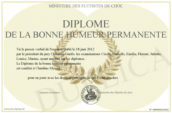 Envoyez par email votre Diplôme de la bonne humeur permanente personalisé