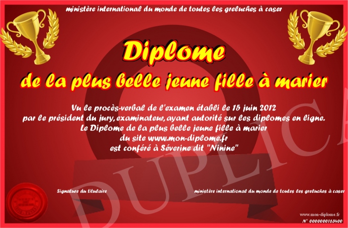 Envoyez par email votre Diplôme de la plus belle jeune fille à marier personalisé
