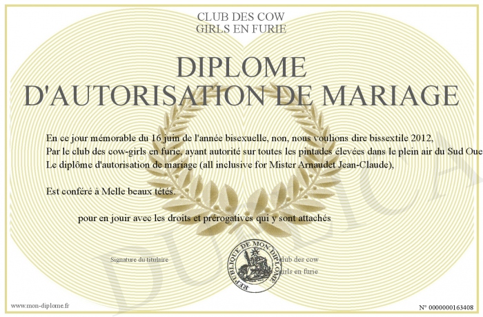 Envoyez par email votre diplôme d'autorisation de mariage personalisé