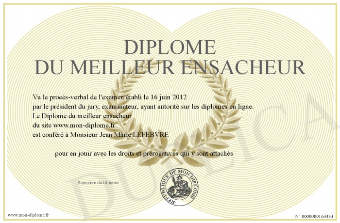 Envoyez par email votre Diplôme du meilleur ensacheur personalisé