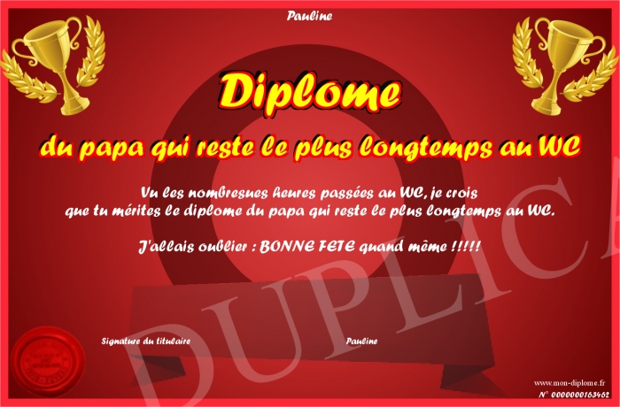 Envoyez par email votre Diplôme du papa qui reste le plus longtemps au WC personalisé