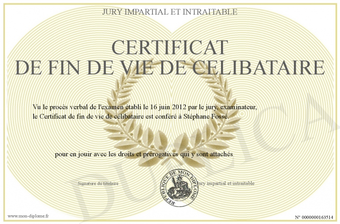 Envoyez par email votre Certificat de fin de vie de célibataire personalisé