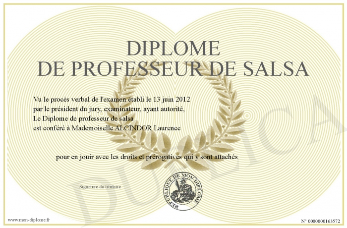 Envoyez par email votre Diplôme de professeur de salsa personalisé