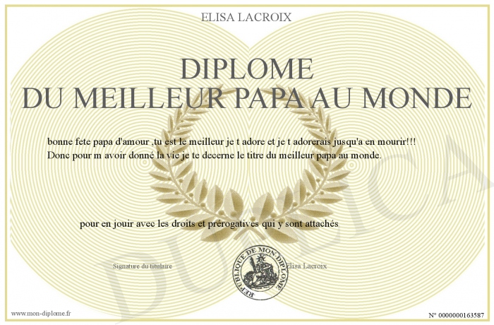 Envoyez par email votre Diplôme du meilleur papa au monde personalisé
