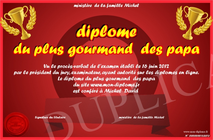 Envoyez par email votre diplome du plus gourmand des papa personalisé