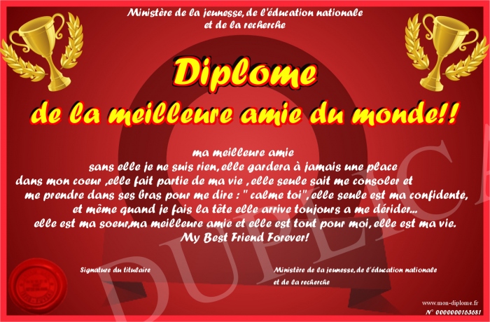 Envoyez par email votre Diplôme de la meilleure amie du monde!! personalisé