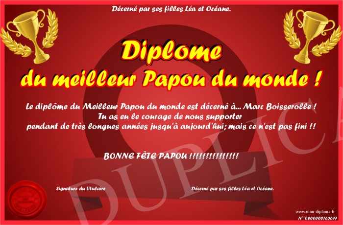 Envoyez par email votre Diplôme du meilleur Papou du monde ! personalisé
