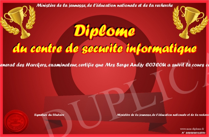 Envoyez par email votre Diplôme du centre de securite informatique personalisé