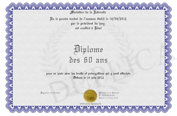 Envoyez par email votre Diplôme des 60 ans personalisé