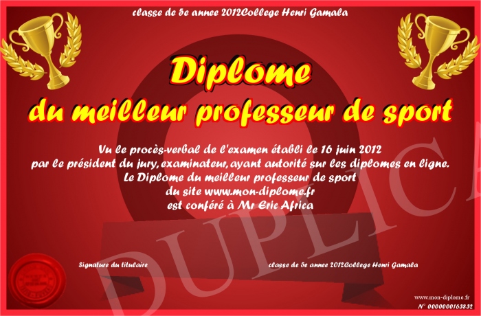 Envoyez par email votre Diplôme du meilleur professeur de sport personalisé