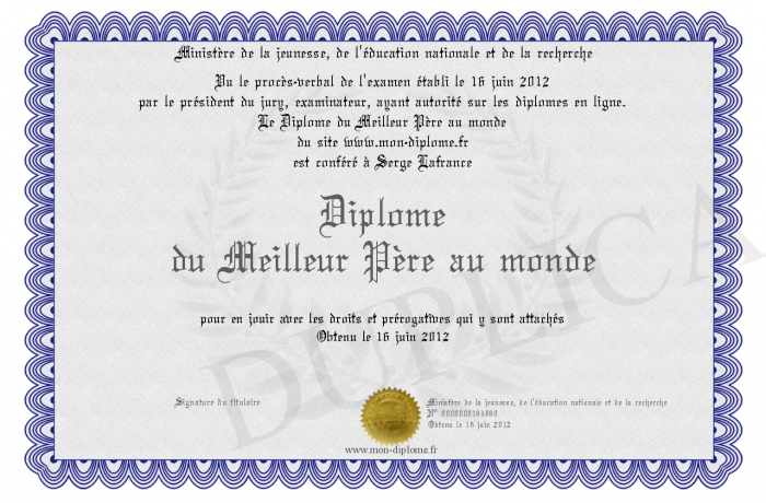 Envoyez par email votre Diplôme du Meilleur Père au monde personalisé