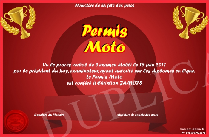 Envoyez par email votre Permis Moto personalisé