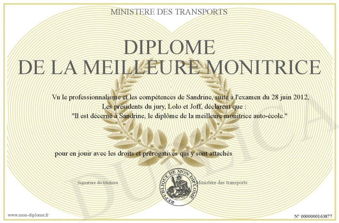 Envoyez par email votre Diplôme de la meilleure monitrice personalisé