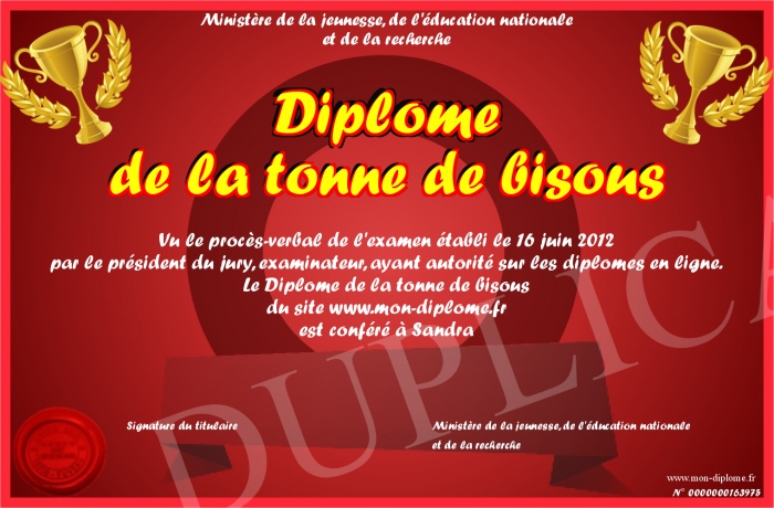 Envoyez par email votre Diplôme de la tonne de bisous personalisé