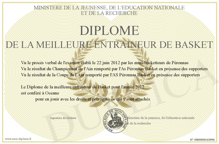 Envoyez par email votre Diplôme de la meilleure entraineur de Basket personalisé