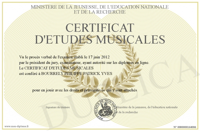 Envoyez par email votre CERTIFICAT D'ETUDES MUSICALES personalisé