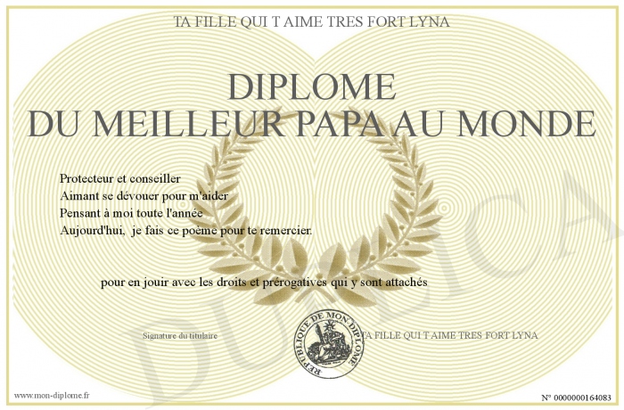 Envoyez par email votre DIPLOME DU MEILLEUR PAPA AU MONDE personalisé