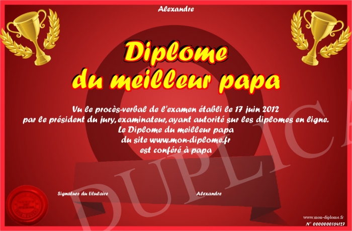 Envoyez par email votre Diplôme du meilleur papa personalisé