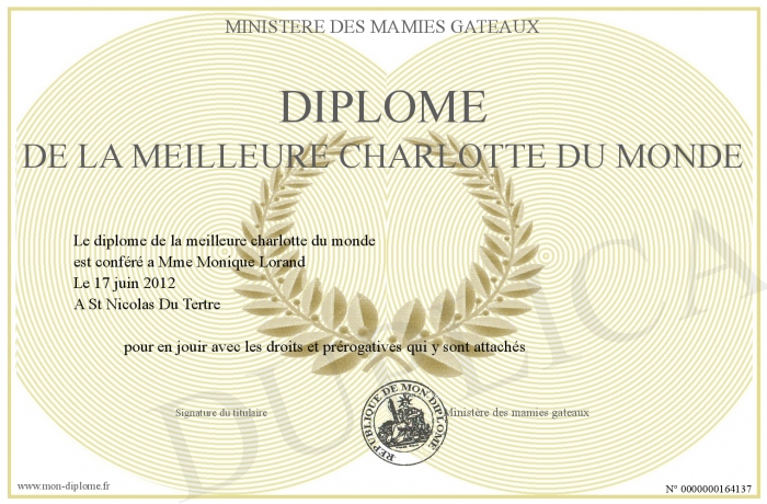Envoyez par email votre Diplôme de la meilleure charlotte du monde personalisé