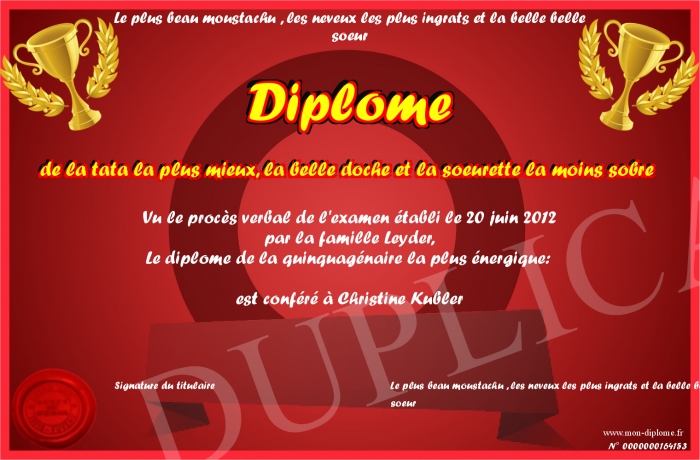 Envoyez par email votre Diplôme de la tata la plus mieux, la belle doche et la soeurette la moins sobre personalisé