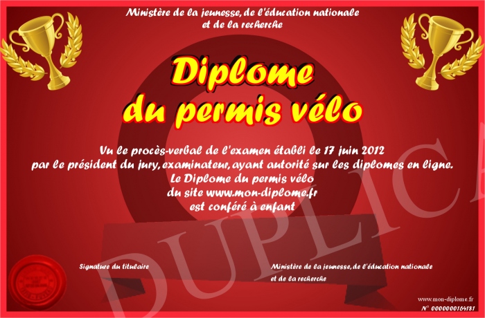 Envoyez par email votre Diplôme du permis vélo personalisé