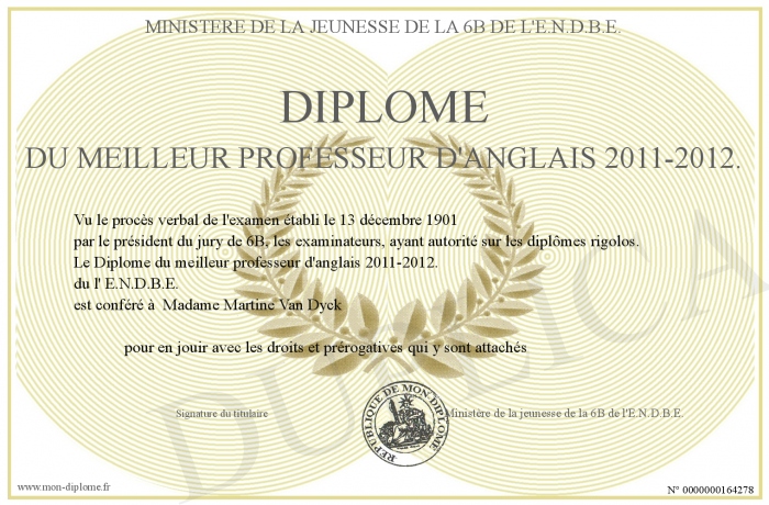 Envoyez par email votre Diplôme du meilleur professeur d'anglais 2011-2012. personalisé
