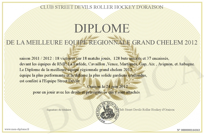 Envoyez par email votre Diplôme de la meilleure équipe régionnale grand chelem 2012 personalisé