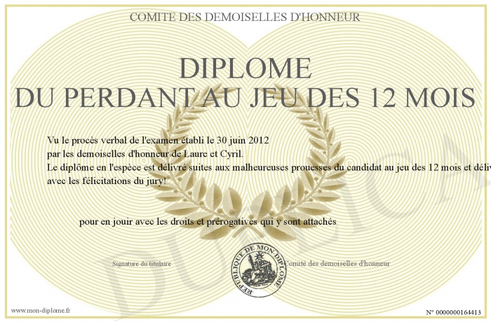 Envoyez par email votre Diplôme du perdant au jeu des 12 mois personalisé