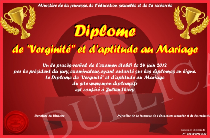 Envoyez par email votre Diplôme de -Verginité- et d'aptitude au Mariage personalisé